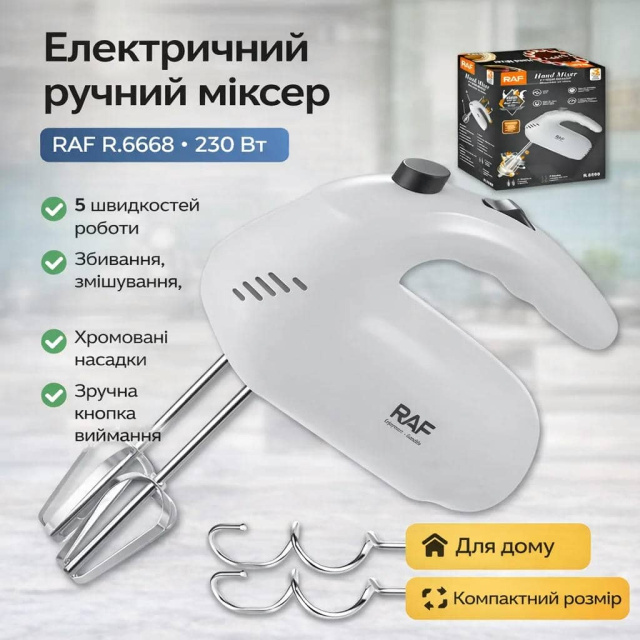 Електричний ручний міксер з 5 режимами роботи та хромованими насадками RAF R.6668 230W