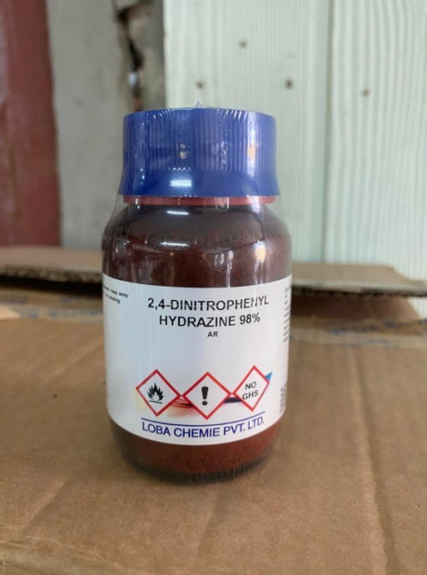 2,4-Динитрофенилгидразин - кристаллы красного цвета, растворим в этилацетате; малорастворим в бензоле, сероуглероде и этаноле; не растворим в воде и в диэтиловом эфире.