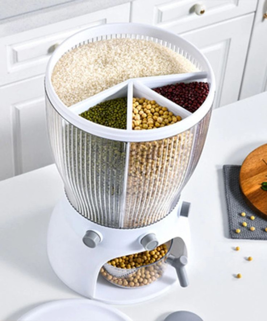 Диспенсер для круп і сипких продуктів з чотирма відсіками. Загальний об'єм – 10 кг. Цей диспенсер для круп можна використовувати як контейнер для зберігання круп, сипких продуктів, сухих сніданків, спецій, горіхів тощо. Кут повороту 360 градусів, 4 секції, знімні перегородки, що полегшує миття. В основі кожної секції зовні знаходяться кнопки, при натисканні крупа насипається в чашу. У комплекті йде додаткова чаша з ручкою і дірочками. За її допомогою можна не тільки насипати крупу, але й ретельно промити при необхідності. Не слід використовувати додатковий сит.У отвори кришки є спеціальний відділ, куди можна помістити кілька часточок часнику або лаврові листочки, таким чином можна не боятися, що в крупі заведуться жучки. Стильний дизайн, компактний розмір, функціональний. Цей стильний диспенсер для круп впишеться в будь-який інтер'єр кухні і буде оцінений кожною господинею.