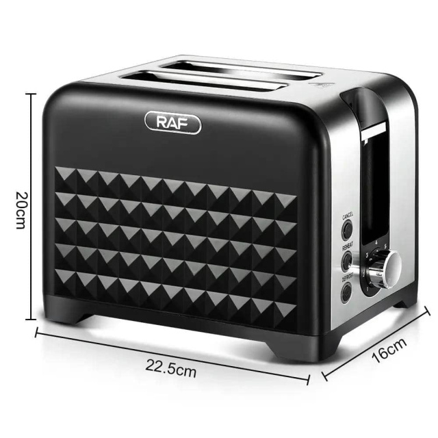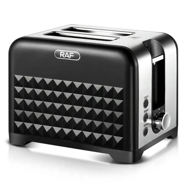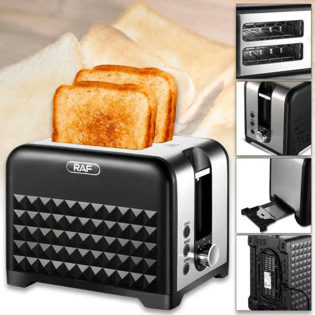 Тостер RAF R.2101– це надійне і функціональне устаткування, яке допоможе швидко приготувати хрустке тости та легкі закуски. Він оснащений двома відділеннями, що дозволяє одночасно підсмажувати два скибки хліба. Завдяки потужному нагрівальному елементу в 900 Вт тости готуються за лічені хвилини. Стильний корпусз нержавіючої сталі з чорною мікрокристалічною панеллю не тільки надає устаткуванню сучасний вигляд, але й робить його стійким до пошкоджень та легким у обслуговуванні. Зручне механічне управління з 7 рівнями підсмажування дозволяє вибрати ідеальний ступінь хрусткості – від злегка підрум'яненого до насиченого золотистого відтінку. RAF R.2101підтримує кілька режимів роботи, включаючи стандартне підсмажування, підігрів та розморозження хліба. Завдяки функції автоматичного центрування скибки рівномірно підсмажуються з обох сторін. А вбудована захист від перегріву та автоматичне вимикання забезпечують безпеку при використанні.