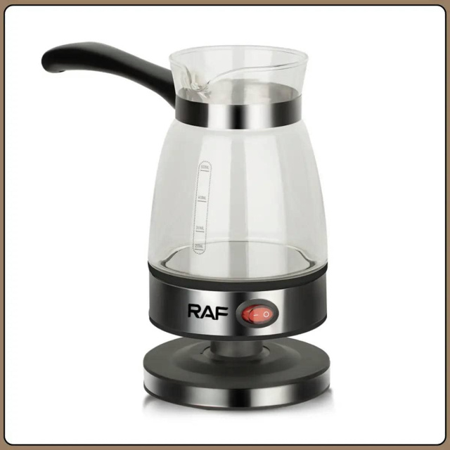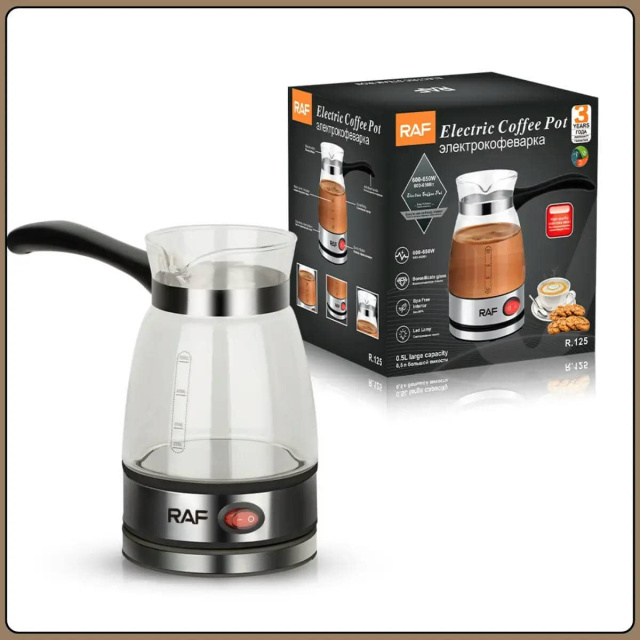Електрична турка RAF R.125 призначена для швидкого та зручного приготування молотої кави вдома, в офісі чи в дорозі. Формат електричної турки дозволяє за кілька хвилин приготувати насичений та ароматний напій без зайвих зусиль. Компактні розміри роблять прилад зручним для зберігання та транспортування, а сучасний дизайн добре вписується в будь-яке оточення. Корпус виконаний з боросилікатного скла та нержавіючої сталі,що забезпечує довговічність та стійкість до високих температур. Кофеварка оснащена автоматичним відключенням при кипінні, індикатором роботи та ручкою, яка не нагрівається, для безпечного використання. Об'єму 0,5 літра достатньо для приготування до чотирьох порцій кави за один цикл. Переваги: