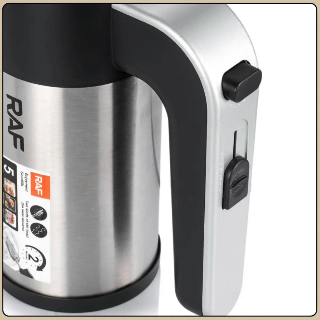 Ручний міксер RAF R.6639 призначений для швидкого та зручного приготування різних стравв домашніх умовах. Висока потужність 800 Вт та п'ять швидкісних режимів дозволяють ефективно збивати, змішувати та замішувати інгредієнти різної щільності, від легких кремів до щільного тіста. Компактний ручний формат забезпечує зручність зберігання та використання на будь-якій кухні. Корпус виготовлений з поєднання міцного пластику та нержавіючої сталі, що забезпечує надійність та довговічність приладу. Ергономічна форма та збалансована вага роблять роботу комфортною навіть при тривалому використанні. Кнопка швидкої зміни насадок спрощує догляд за пристроєм та економить час при готуванні. Переваги: