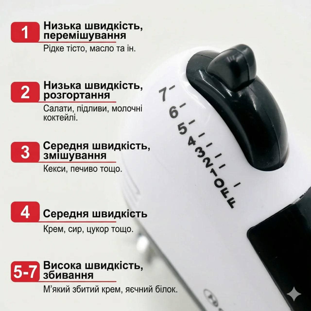 - Багатофункціональність: цей ручний міксер виконує дві основні функції - замішування та взбивання, що дозволяє використовувати його для різних цілей при приготуванні їжі;