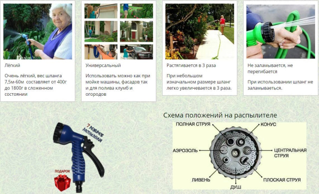 • розтягується при надходженні води – стає в 3 рази довшим. • автоматично повертається у вихідний розмір ― за лічені секунди. • не перекручується, не заломлюється, не плутається. • надміцний і зносостійкий. • ефективно працює в парі з підсилювачем напору. • дуже легкий. • компактний, зручно зберігати.