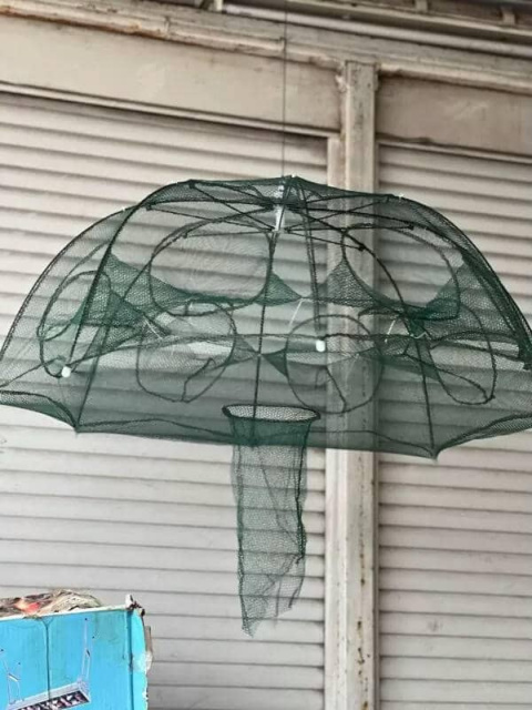 Автоматична складана рибальська сітка – пастка для риби, раків, креветок ∙ Рибальська верша "павук" сконструйована з 8 кутів, 8 отворів і 8 звужуючих дуг до вершини, обтягнутих сіткою. Розкривається пастка так само як і звичайна парасолька. Щоб відкрити пастку, необхідно потягнути за шнурок зверху. Закривається пастка за допомогою кнопки. У закритому вигляді верша практично не займе місця у Вашій сумці. Сітка виготовлена з нейлону. Дуже міцного матеріалу, а дуги виготовлені з нержавіючої сталі.