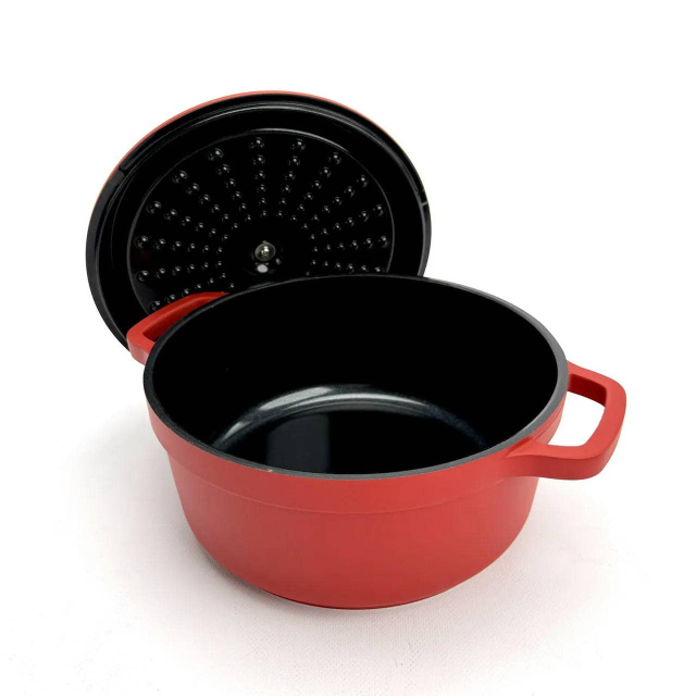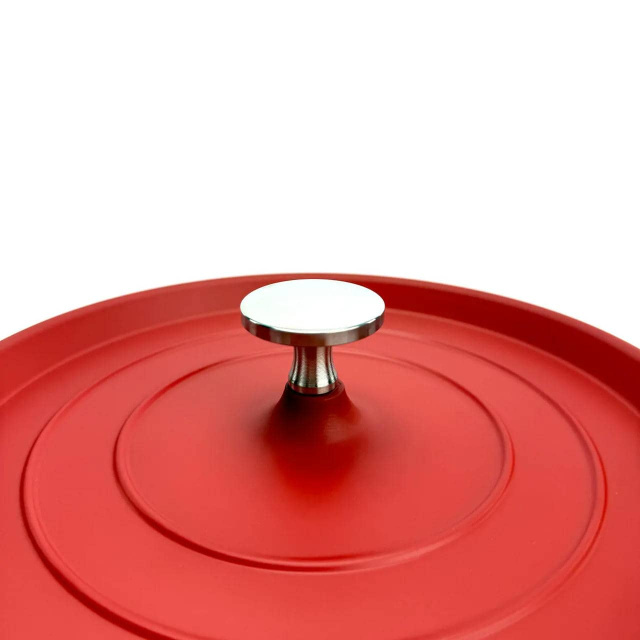 - Премиальный дизайн: Матовый красный цвет и стильные ручки из нержавеющей стали на крышках.
