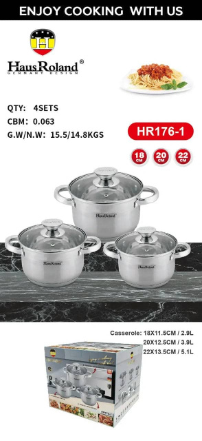 Набор Haus Roland HR176-1 предлагает оптимальный комплект посуды для решения большинства кулинарных задач. Он включает три кастрюли, выполненные из качественной и гигиеничной нержавеющей стали 201. Корпус с сатиновой полировкой и элегантным зеркальным поясом не только отлично выглядит, но и прост в уходе.