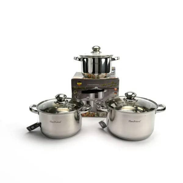 Набір Haus Roland HR148-6 створений для тих, хто цінує насамперед практичність, довговічність та суворої естетики. Включаючи в себе три каструлі найпопулярніших розмірів, він стане надійною основою на будь-якій кухні. Посуд повністю виготовлений з високоякісної нержавіючої сталі 201 з ефектним дзеркальним поліруванням усередину і зовні. Такий корпус не тільки елегантно виглядає, але й відрізняється гігієнічністю та простотою в догляді. Ергономічні порожисті ручки на надійному заклепочному кріпленні сконструйовані так, щоб повільніше нагріватися, забезпечуючи безпечне та комфортне використання. П'ятишарове капсульне дно гарантує швидкий і рівномірний розігрів по всій поверхні, що дозволяє економити енергію та досягати ідеальних результатів на всіх типах плит. Контролювати процес приготування допоможуть кришки з загартованого скла з отвором для випуску пари, а точно слідувати рецепту — внутрішня мірна шкала. Переваги