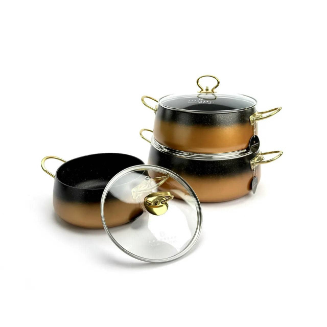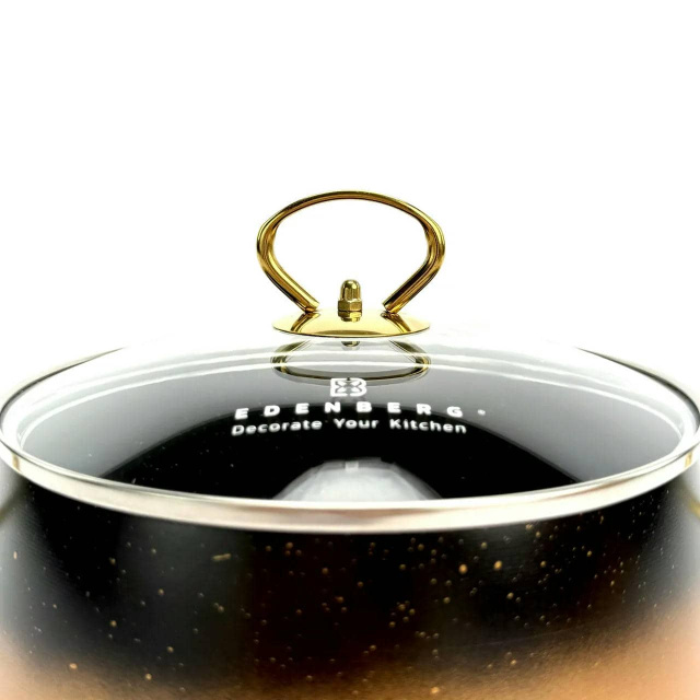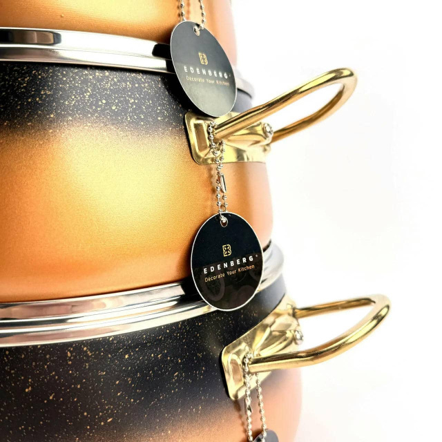 Набір EDENBERG SD-6 — це поєднання стилю та практичності. Корпус каструль виготовлений з високоякісного литого алюмінію з товстими стінками (4 мм), що гарантує ідеальне розподілення тепла, швидке приготування та високу стійкість до деформації. Внутрішнє та зовнішнє мармурове покриття має відмінні антипригарні властивості, високу міцність і легко миється. Особливе дно "Turbo Induction" забезпечує максимальну енергоефективність і дозволяє використовувати посуд на всіх типах плит, включаючи індукційні. Ефектні ручки з нержавіючої сталі з золотим покриттям додають набору розкоші, а кришки з загартованого термостійкого скла дозволяють контролювати процес приготування. Переваги