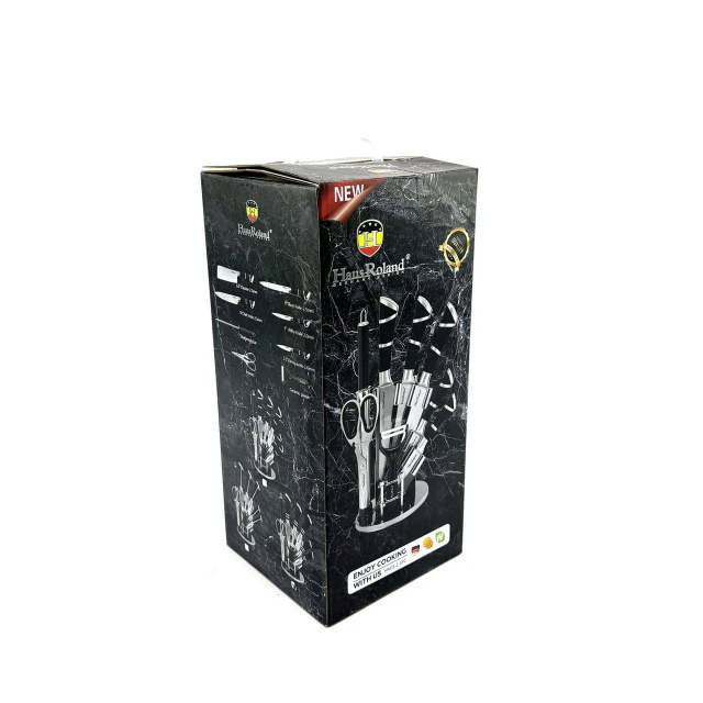 Набір Haus Roland HR615-2 об'єднує в собі професійну продуктивність та ефектний дизайн. Гострі лезла зі сталі 3Cr13 гарантують легкість та точність різу, а порожнисті рукоятки з нержавіючої сталі 430 забезпечують ідеальний баланс і зменшують втому руки. Двокольоровий дизайн рукояток, що поєднує матову сталь і чорне покриття, надає набору строгий та сучасний вигляд. У комплекті ви знайдете 5 ножів, включаючи 18-сантиметровий топірик, а також мусат, ножиці та овочечистку з керамічним лезлом. Все це розміщується на стильній акриловій підставці, що обертається на 360 градусів для максимальної зручності. Переваги