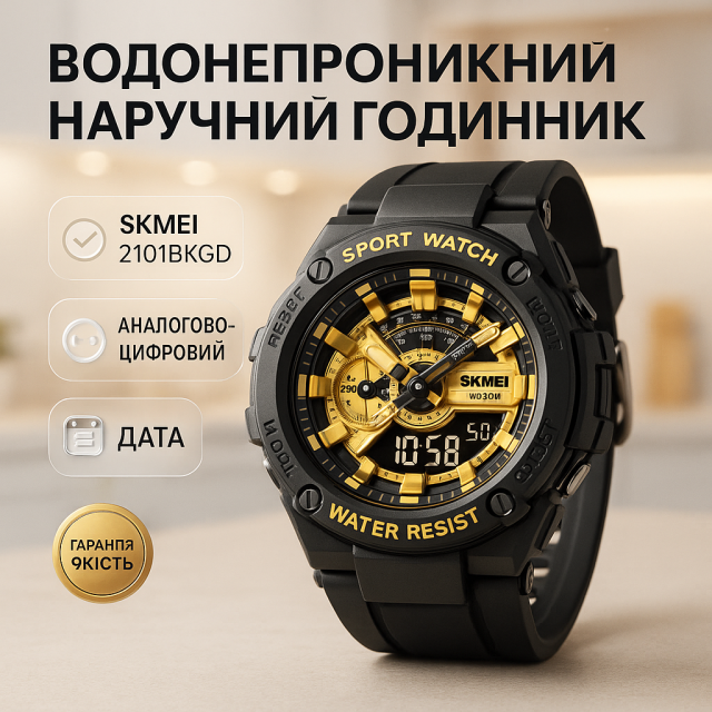 Годинник SKMEI 2101BKGD — це яскравий акцент у вашому стилі, що поєднує сміливий золотий циферблат з чорним корпусом. Модель виконана у спортивному дизайні з комбінованим типом індикації, що дозволяє одночасно користуватися стрілками та цифровим дисплеєм. Такий годинник стане не лише практичним аксесуаром, а й виразною деталлю образу.