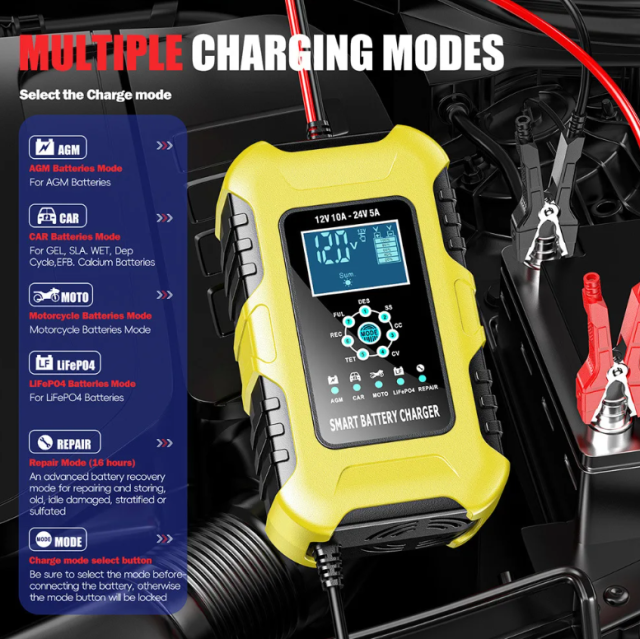 7-етапний зарядний пристрій підходить для більшості типів свинцевих акумуляторів, включаючи кальцієві, гелеві, A GM, LiFePo4, вологі, свинцево-кислотні тощо.