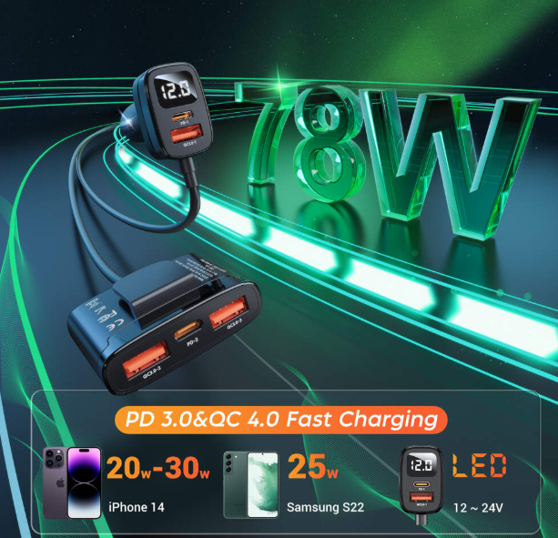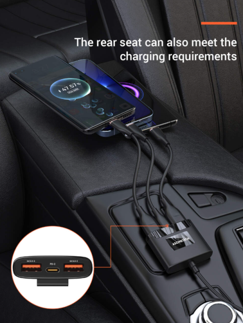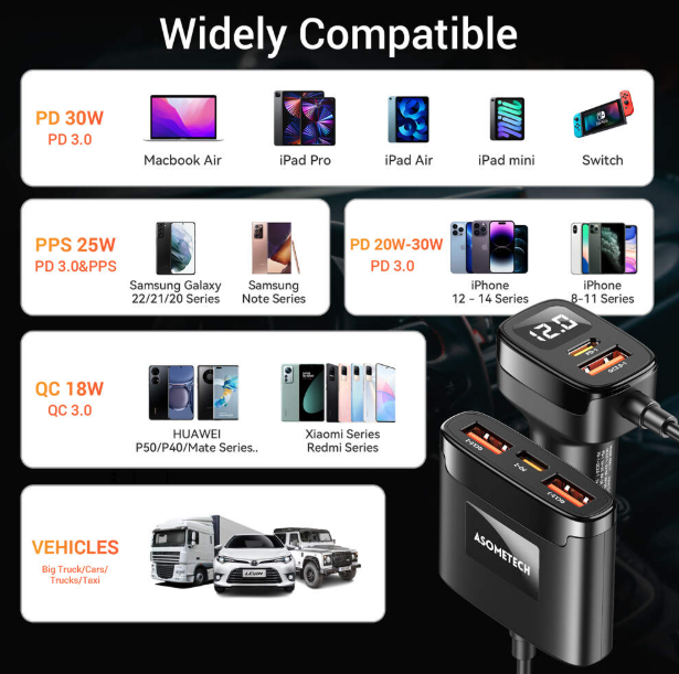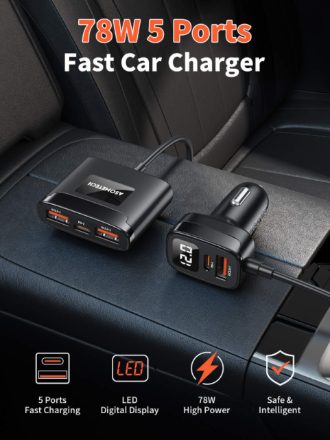 Автомобільний зарядний пристрій ASOMETECH 78W з виносним блоком зручний для подорожей і дозволяє заряджати 5 пристроїв одночасно. Він підтримує всі популярні протоколи швидкої зарядки. Незалежно від того, яким гаджетом ви користуєтеся, цей зарядний пристрій підходить саме вам. Він сумісний з більшісттю мобільних пристроїв, у тому числі мобільними телефонами, смартфонами, планшетами, навігаторами, гарнітурою, тощо.